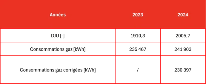 La consommation de gaz 2024 (241 903 kWh) est plus élevée que celle de 2023 (235 467 kWh). Cependant, lorsqu’elle est corrigée avec les DJU de l’année de référence (2023), elle est de 230 397 kWh c’est-à-dire qu’elle est inférieure à la consommation de référence. La quantité d’énergie dépensée pour un contexte climatique similaire sera donc plus faible.